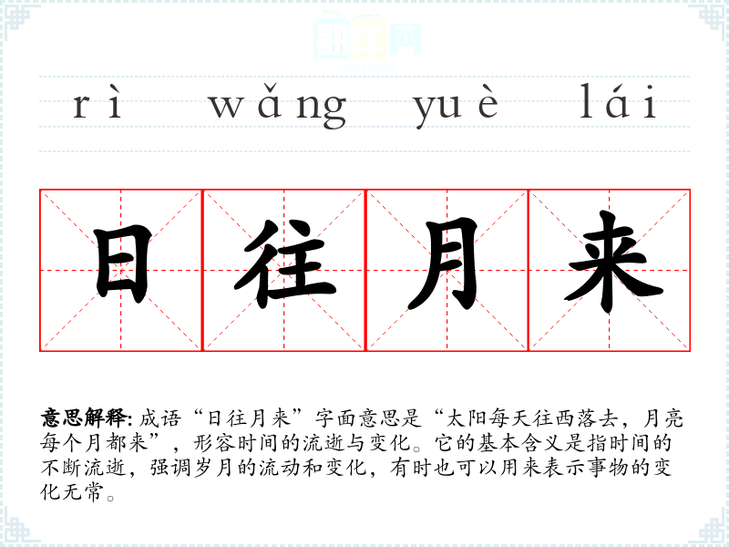 成语“日往月来”字面意思是“太阳每天往西落去,月亮每个月都来”,形容时间的流逝与变化。它的基本含义是指时间的不断流逝,强调岁月的流动和变化,有时也可以用来表示事物的变化无常。