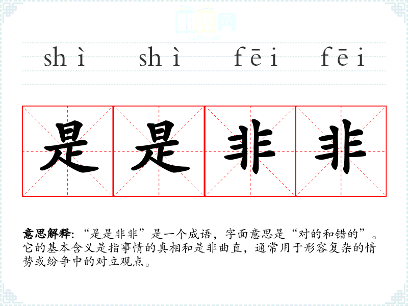 “是是非非”是一个成语,字面意思是“对的和错的”。它的基本含义是指事情的真相和是非曲直,通常用于形容复杂的情势或纷争中的对立观点。
