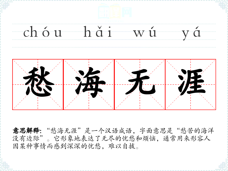 “愁海无涯”是一个汉语成语,字面意思是“愁苦的海洋没有边际”。它形象地表达了无尽的忧愁和烦恼,通常用来形容人因某种事情而感到深深的忧愁,难以自拔。