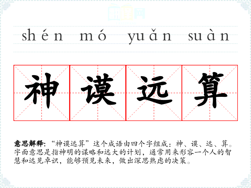 “神谟远算”这个成语由四个字组成:神、谟、远、算。字面意思是指神明的谋略和远大的计划,通常用来形容一个人的智慧和远见卓识,能够预见未来,做出深思熟虑的决策。