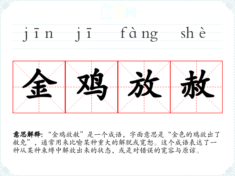 “金鸡放赦”是一个成语,字面意思是“金色的鸡放出了赦免”,通常用来比喻某种重大的解脱或宽恕。这个成语表达了一种从某种束缚中解放出来的状态,或是对错误的宽容与原谅。
