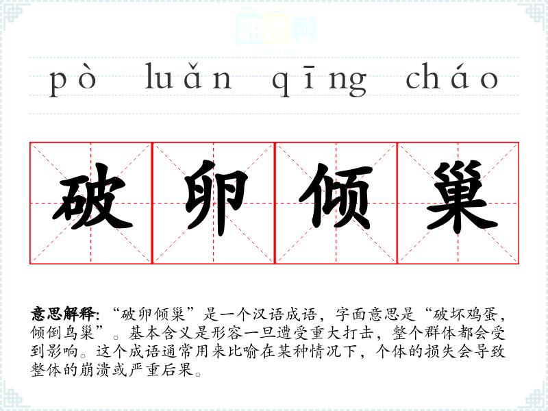 “破卵倾巢”是一个汉语成语,字面意思是“破坏鸡蛋,倾倒鸟巢”。基本含义是形容一旦遭受重大打击,整个群体都会受到影响。这个成语通常用来比喻在某种情况下,个体的损失会导致整体的崩溃或严重后果。