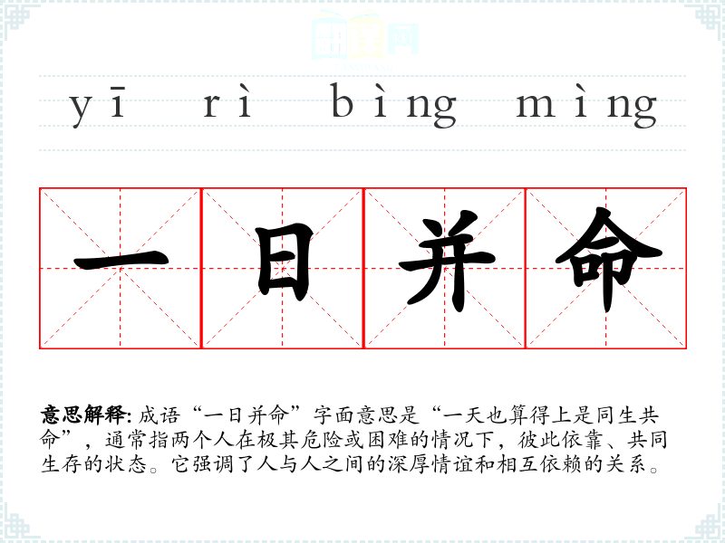 成语“一日并命”字面意思是“一天也算得上是同生共命”,通常指两个人在极其危险或困难的情况下,彼此依靠、共同生存的状态。它强调了人与人之间的深厚情谊和相互依赖的关系。