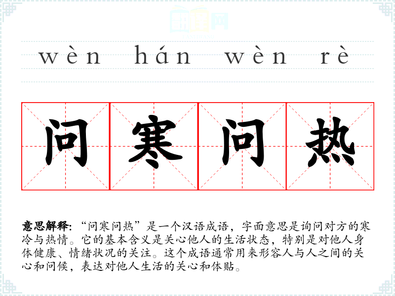 “问寒问热”是一个汉语成语,字面意思是询问对方的寒冷与热情。它的基本含义是关心他人的生活状态,特别是对他人身体健康、情绪状况的关注。这个成语通常用来形容人与人之间的关心和问候,表达对他人生活的关心和体贴。