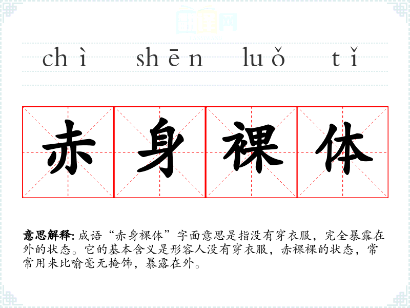 | 赤身裸体 | 赤:光着。大部分身体或全身裸露。 |