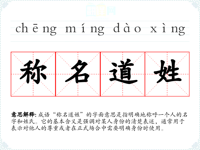 成语“称名道姓”的字面意思是指明确地称呼一个人的名字和姓氏。它的基本含义是强调对某人身份的清楚表述,通常用于表示对他人的尊重或者在正式场合中需要明确身份时使用。