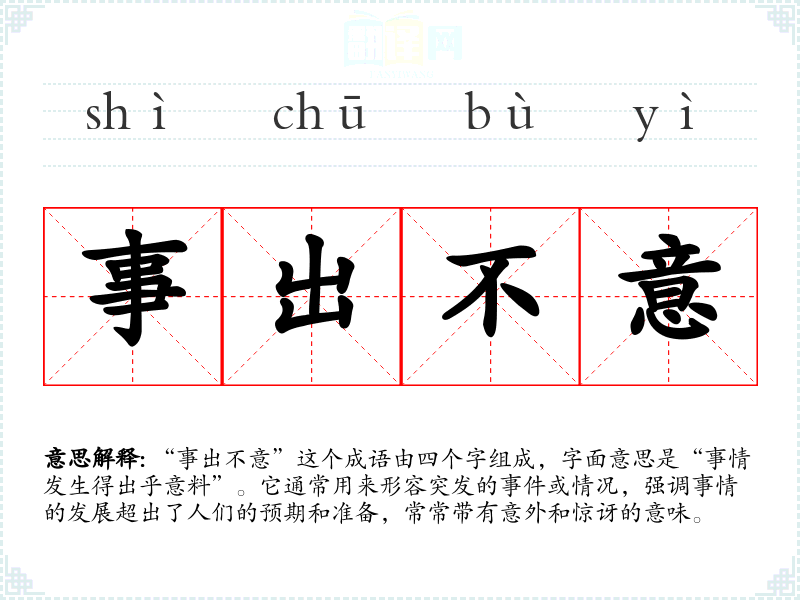 “事出不意”这个成语由四个字组成,字面意思是“事情发生得出乎意料”。它通常用来形容突发的**或情况,强调事情的发展超出了人们的预期和准备,常常带有意外和惊讶的意味。