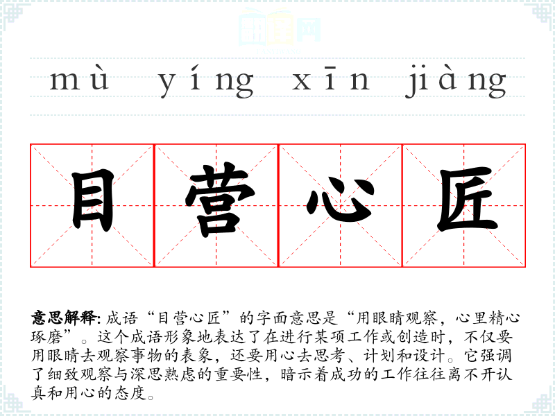 成语“目营心匠”的字面意思是“用眼睛观察,心里精心琢磨”。这个成语形象地表达了在进行某项工作或创造时,不仅要用眼睛去观察事物的表象,还要用心去思考、计划和设计。它强调了细致观察与深思熟虑的重要性,暗示着成功的工作往往离不开认真和用心的态度。