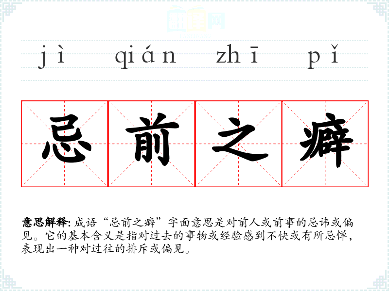 成语“忌前之癖”字面意思是对前人或前事的忌讳或偏见。它的基本含义是指对过去的事物或经验感到不快或有所忌惮,表现出一种对过往的排斥或偏见。
