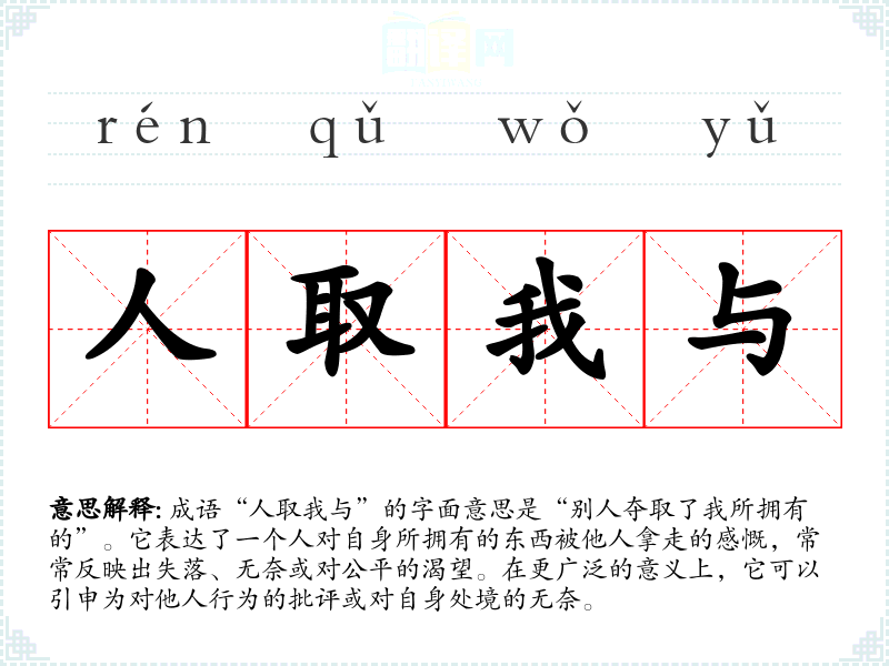 成语“人取我与”的字面意思是“别人夺取了我所拥有的”。它表达了一个人对自身所拥有的东西被他人拿走的感慨,常常反映出失落、无奈或对公平的渴望。在更广泛的意义上,它可以引申为对他人行为的批评或对自身处境的无奈。