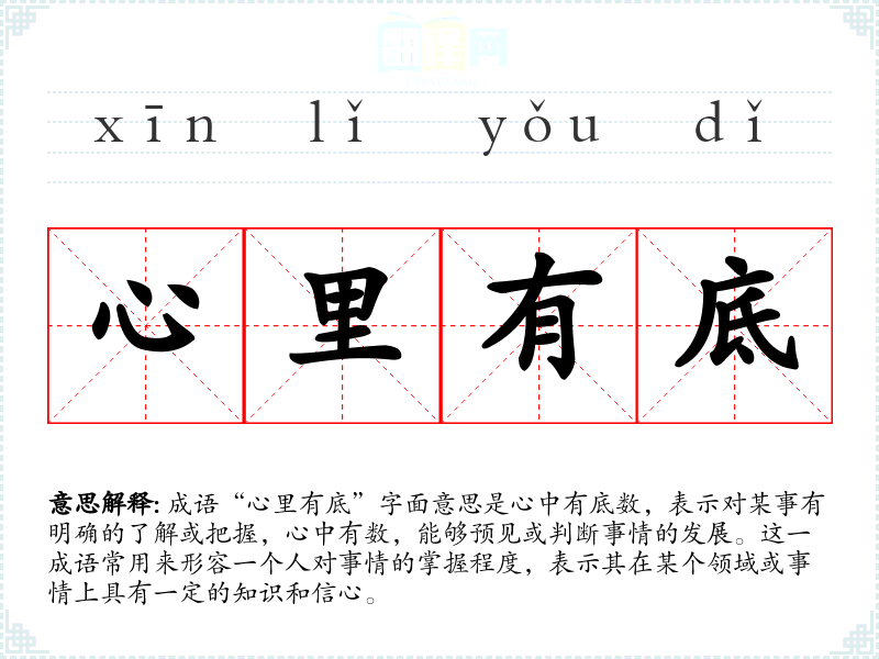 在**文化中,信心和把握是非常重要的品质,特别是在商业和人际交往中。成语“心里有底”反映了人们对知识和经验的重视,强调了在面对挑战时,内心的掌控感所带来的安全感。在现代社会,随着信息的快速传播,能够“心里有底”的人往往能在竞争中脱颖而出。