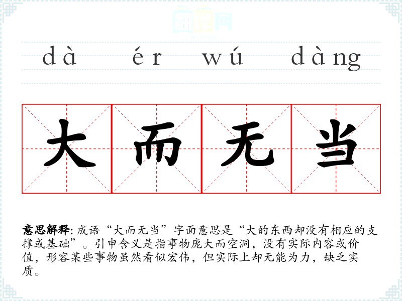 成语“大而无当”字面意思是“大的东西却没有相应的支撑或基础”。引申含义是指事物庞大而空洞,没有实际内容或价值,形容某些事物虽然看似宏伟,但实际上却无能为力,缺乏实质。