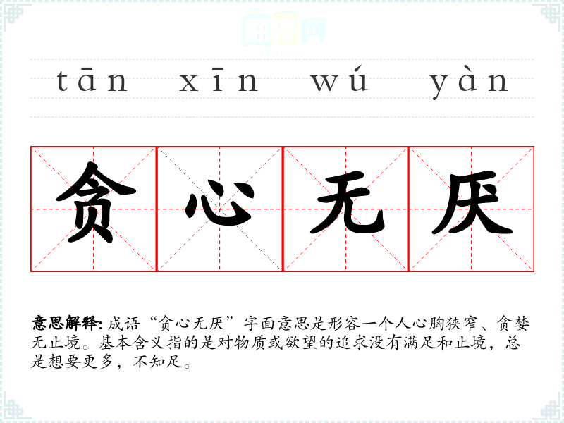 成语“贪心无厌”字面意思是形容一个人心胸狭窄、贪婪无止境。基本含义指的是对物质或欲望的追求没有满足和止境,总是想要更多,不知足。