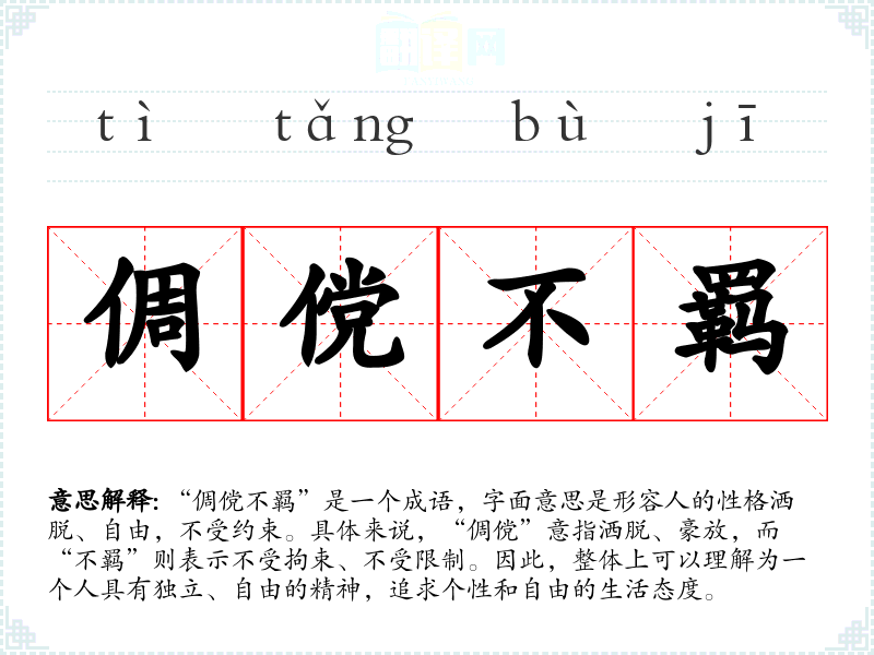 “倜傥不羁”是一个成语,字面意思是形容人的性格洒脱、自由,不受约束。具体来说,“倜傥”意指洒脱、豪放,而“不羁”则表示不受拘束、不受限制。因此,整体上可以理解为一个人具有独立、自由的精神,追求个性和自由的生活态度。