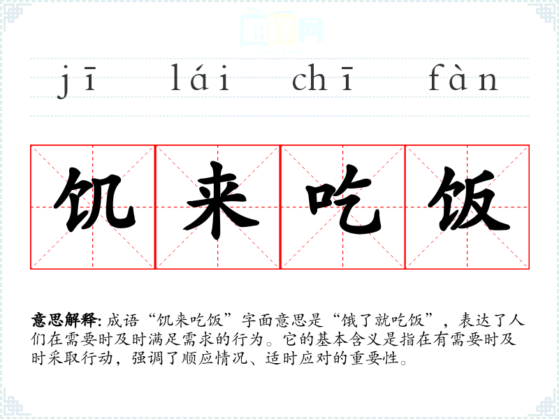 成语“饥来吃饭”字面意思是“饿了就吃饭”,表达了人们在需要时及时满足需求的行为。它的基本含义是指在有需要时及时采取行动,强调了顺应情况、适时应对的重要性。