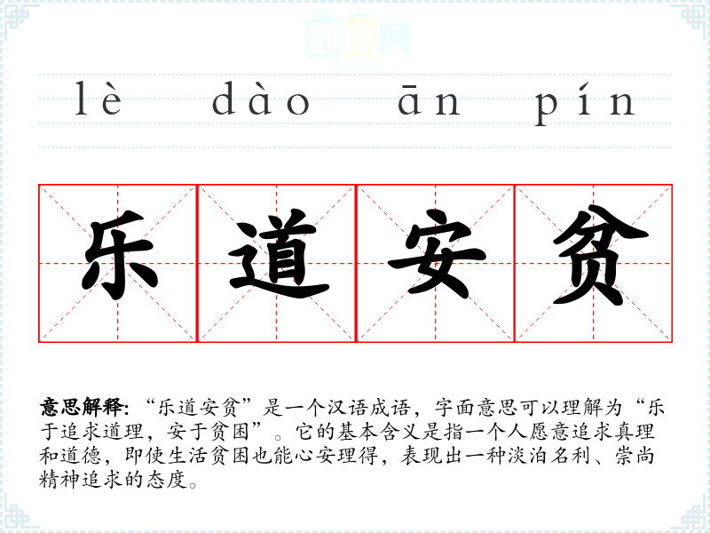 “乐道安贫”是一个汉语成语,字面意思可以理解为“乐于追求道理,安于贫困”。它的基本含义是指一个人愿意追求真理和道德,即使生活贫困也能心安理得,表现出一种淡泊名利、崇尚精神追求的态度。