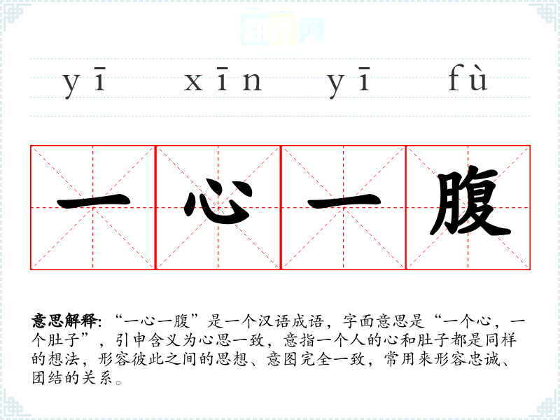 “一心一腹”是一个汉语成语,字面意思是“一个心,一个肚子”,引申含义为心思一致,意指一个人的心和肚子都是同样的想法,形容彼此之间的思想、意图完全一致,常用来形容忠诚、团结的关系。