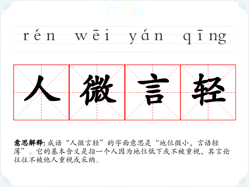 | 人微言轻 | 地位低,说话不受人重视。 |