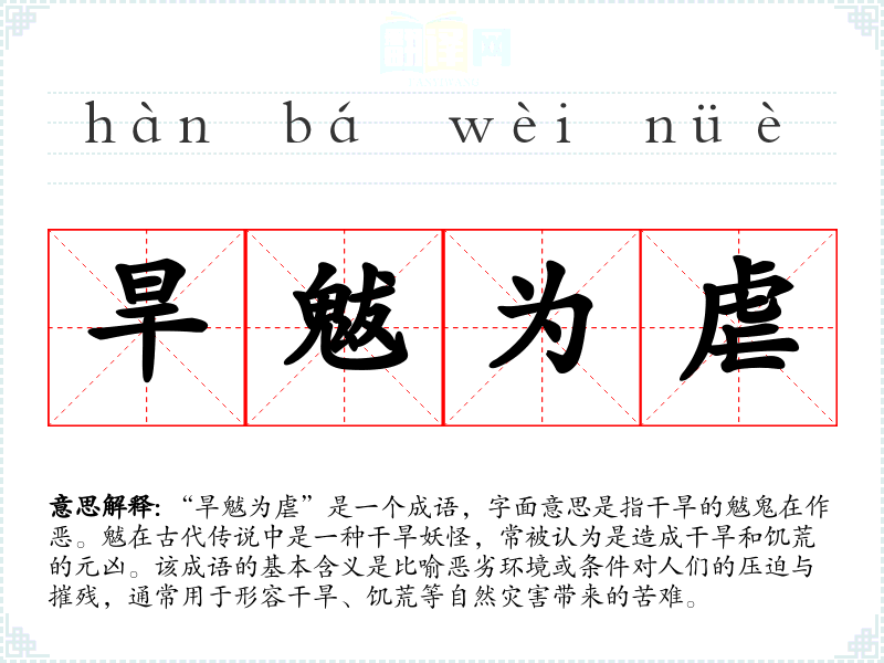 “旱魃为虐”是一个成语,字面意思是指干旱的魃鬼在作恶。魃在古代传说中是一种干旱妖怪,常被认为是造成干旱和饥荒的元凶。该成语的基本含义是比喻恶劣环境或条件对人们的压迫与摧残,通常用于形容干旱、饥荒等自然灾害带来的苦难。