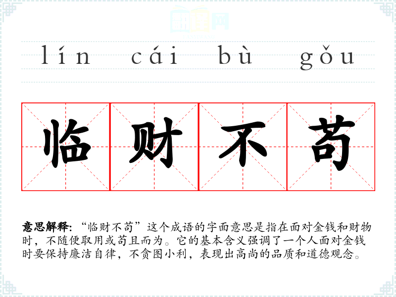 “临财不苟”这个成语的字面意思是指在面对金钱和财物时,不随便取用或苟且而为。它的基本含义强调了一个人面对金钱时要保持廉洁自律,不贪图小利,表现出高尚的品质和道德观念。
