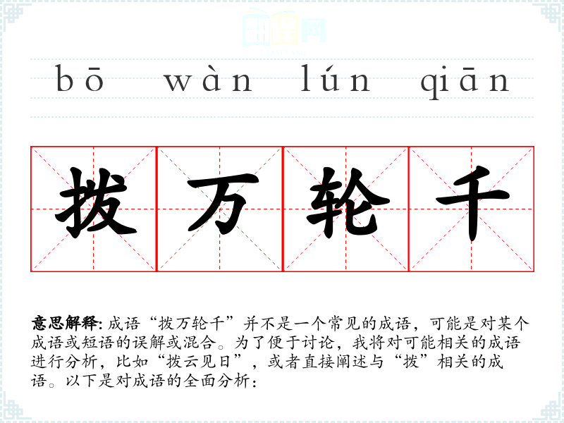 成语“拨万轮千”并不是一个常见的成语,可能是对某个成语或短语的误解或混合。为了便于讨论,我将对可能相关的成语进行分析,比如“拨云见日”,或者直接阐述与“拨”相关的成语。以下是对成语的全面分析: