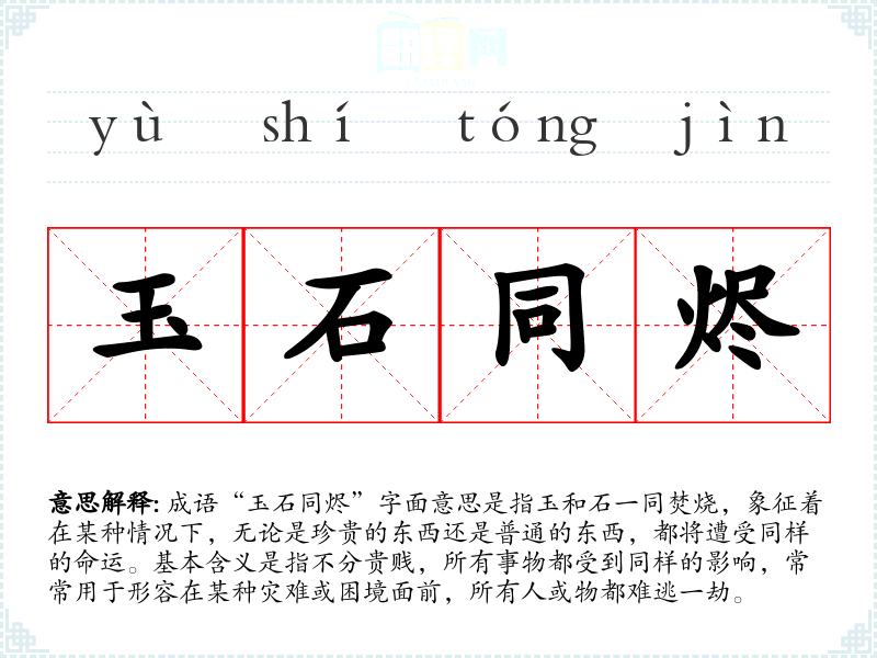 成语“玉石同烬”字面意思是指玉和石一同焚烧,象征着在某种情况下,无论是珍贵的东西还是普通的东西,都将遭受同样的命运。基本含义是指不分贵贱,所有事物都受到同样的影响,常常用于形容在某种灾难或困境面前,所有人或物都难逃一劫。