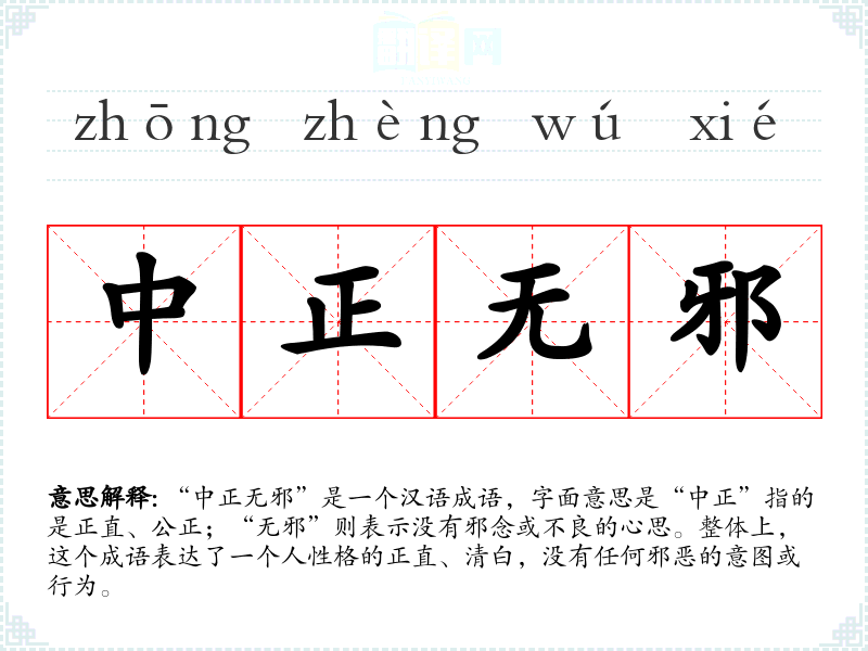 “中正无邪”是一个汉语成语,字面意思是“中正”指的是正直、公正;“无邪”则表示没有邪念或不良的心思。整体上,这个成语表达了一个人性格的正直、清白,没有任何邪恶的意图或行为。