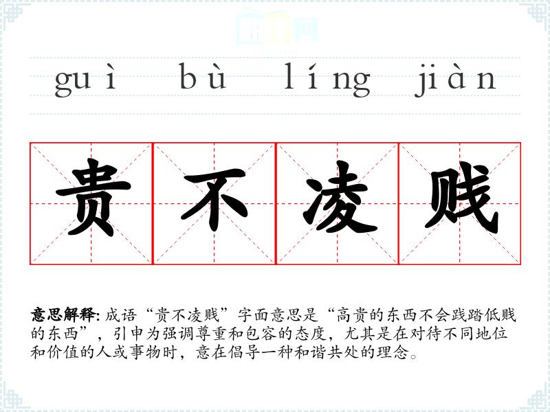 成语“贵不凌贱”字面意思是“高贵的东西不会践踏低贱的东西”,引申为强调尊重和包容的态度,尤其是在对待不同地位和价值的人或事物时,意在倡导一种和谐共处的理念。