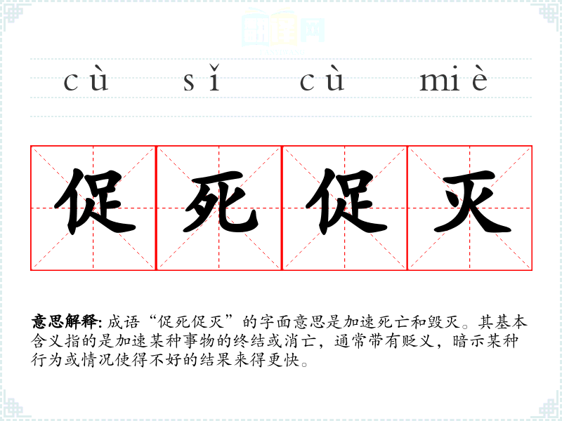 - 反义成语:延年益寿、长盛不衰。反义成语强调的是延续和繁荣,与“促死促灭”的消亡和结束形成鲜明对比。