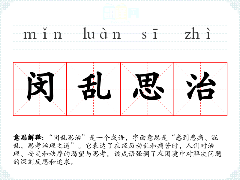 “闵乱思治”是一个成语,字面意思是“感到悲痛、混乱,思考治理之道”。它表达了在经历动乱和痛苦时,人们对治理、安定和秩序的渴望与思考。该成语强调了在困境中对解决问题的深刻反思和追求。