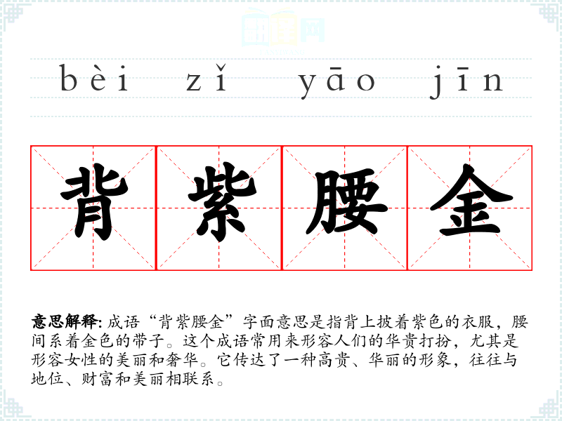 成语“背紫腰金”字面意思是指背上披着紫色的衣服,腰间系着金色的带子。这个成语常用来形容人们的华贵打扮,尤其是形容女性的美丽和奢华。它传达了一种高贵、华丽的形象,往往与地位、财富和美丽相联系。