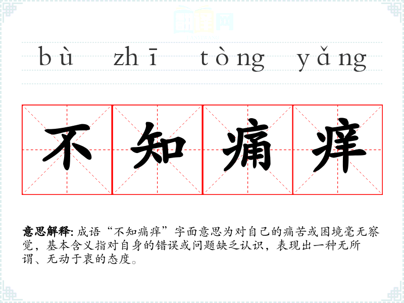成语“不知痛痒”字面意思为对自己的痛苦或困境毫无察觉,基本含义指对自身的错误或问题缺乏认识,表现出一种无所谓、无动于衷的态度。