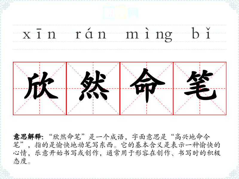 | 欣然命笔 | 命笔:提笔书写。指高兴地提笔写作。 |