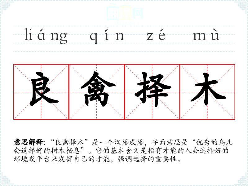 “良禽择木”是一个汉语成语,字面意思是“优秀的鸟儿会选择好的树木栖息”。它的基本含义是指有才能的人会选择好的环境或平台来发挥自己的才能,强调选择的重要性。