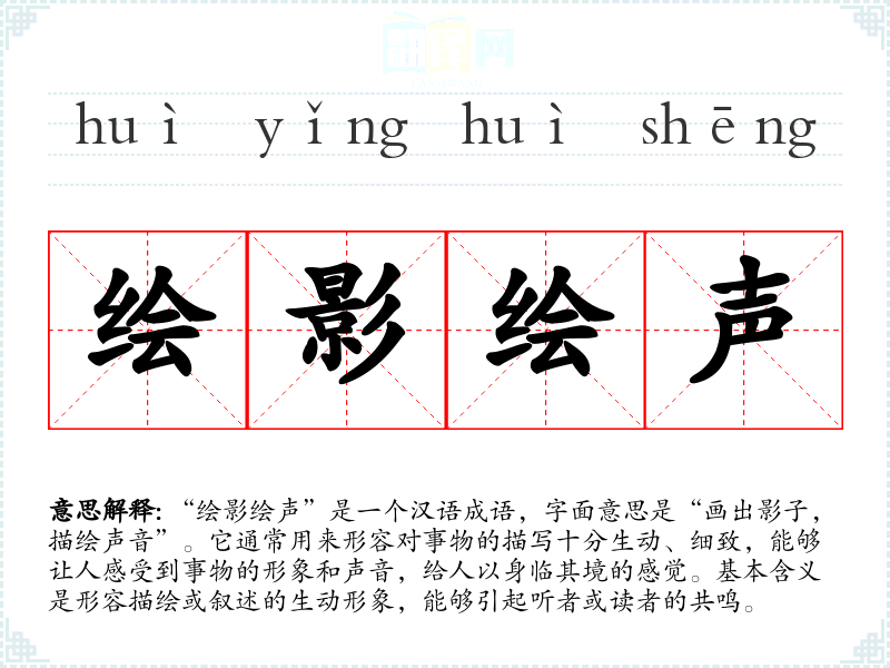 “绘影绘声”是一个汉语成语,字面意思是“画出影子,描绘声音”。它通常用来形容对事物的描写十分生动、细致,能够让人感受到事物的形象和声音,给人以身临其境的感觉。基本含义是形容描绘或叙述的生动形象,能够引起听者或读者的共鸣。