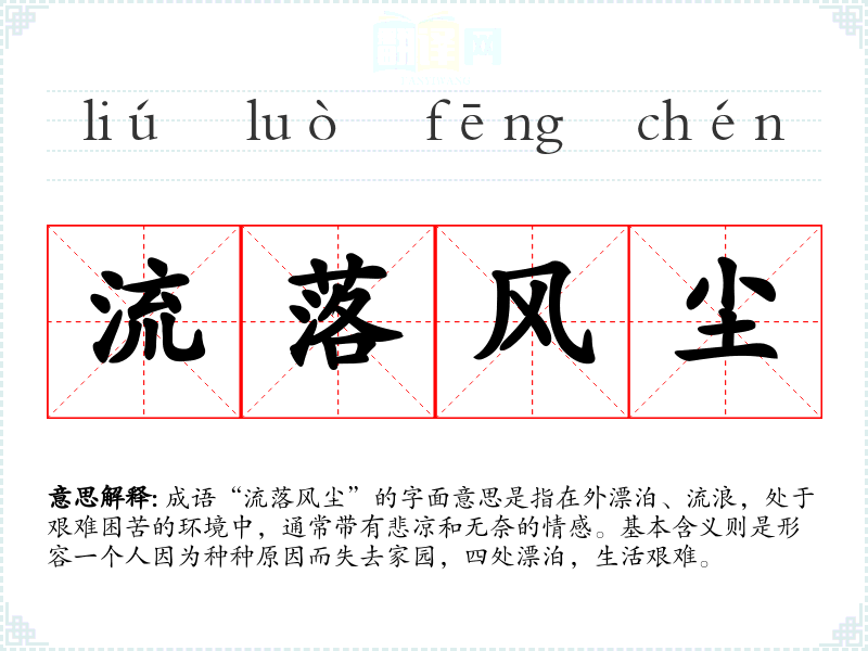 成语“流落风尘”的字面意思是指在外漂泊、流浪,处于艰难困苦的环境中,通常带有悲凉和无奈的情感。基本含义则是形容一个人因为种种原因而失去家园,四处漂泊,生活艰难。