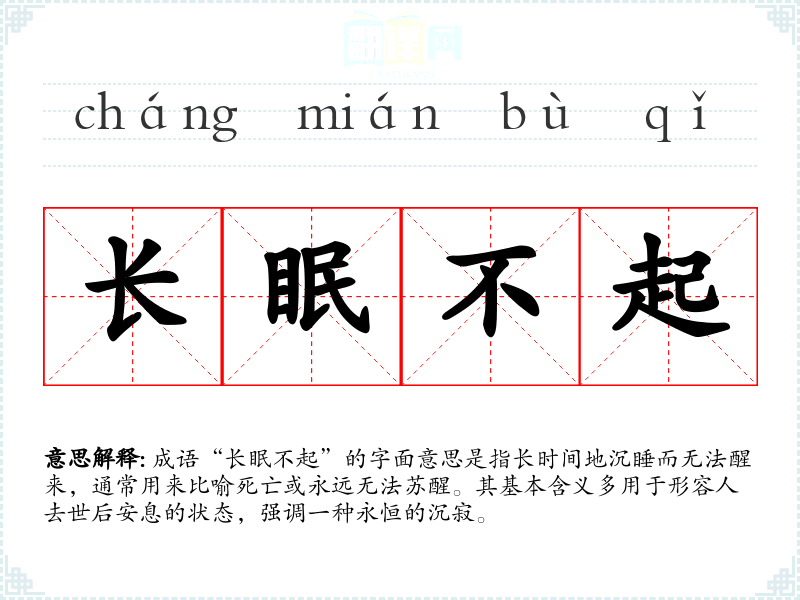 成语“长眠不起”的字面意思是指长时间地沉睡而无法醒来,通常用来比喻死亡或永远无法苏醒。其基本含义多用于形容人去世后安息的状态,强调一种永恒的沉寂。