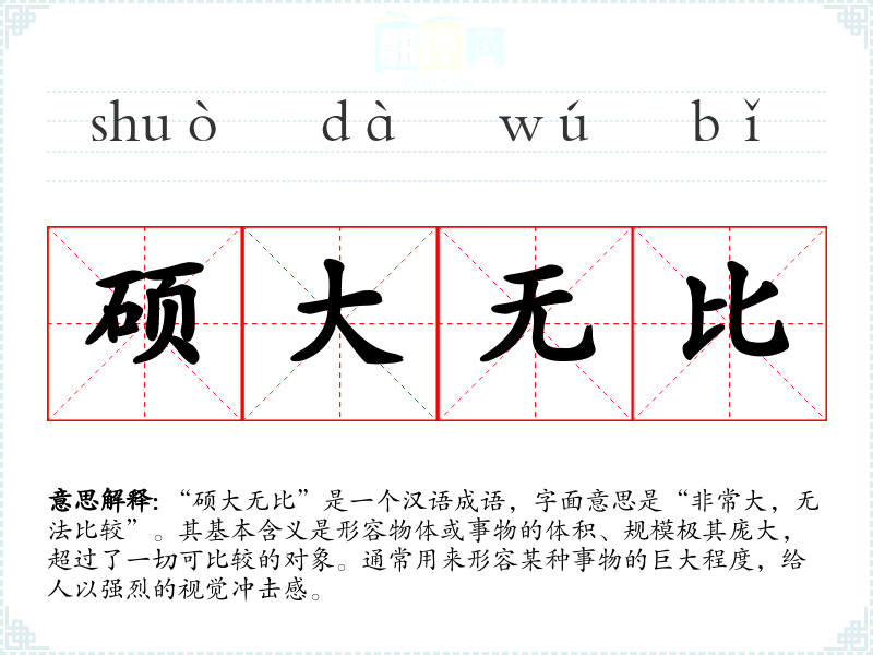 | 硕大无朋 | 硕:大;朋:比。大得没有可以与之相比的。形容极大。 |