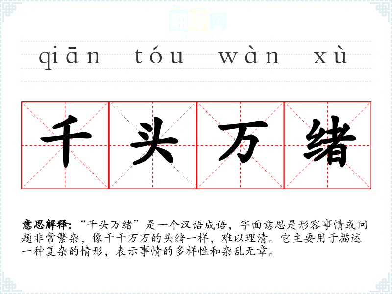 “千头万绪”是一个汉语成语,字面意思是形容事情或问题非常繁杂,像千千万万的头绪一样,难以理清。它主要用于描述一种复杂的情形,表示事情的多样性和杂乱无章。