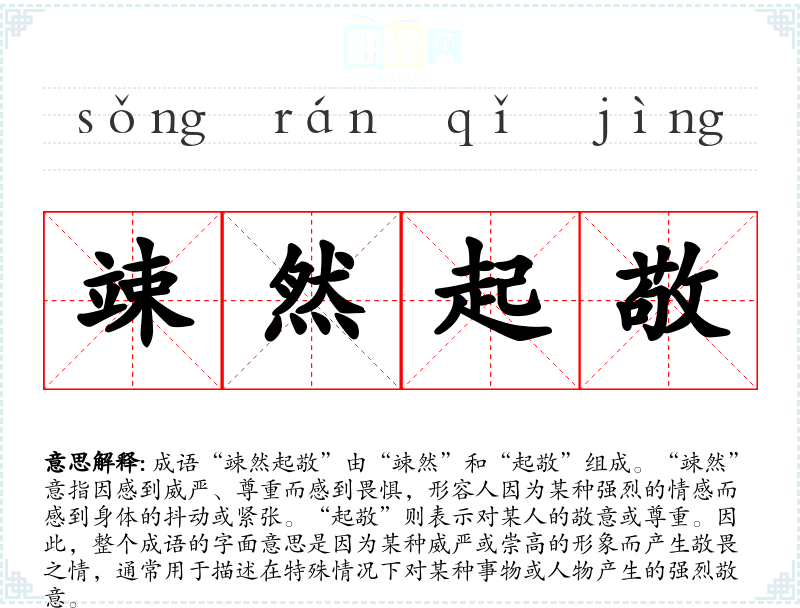 成语“竦然起敬”由“竦然”和“起敬”组成。“竦然”意指因感到威严、尊重而感到畏惧,形容人因为某种强烈的情感而感到身体的抖动或紧张。“起敬”则表示对某人的敬意或尊重。因此,整个成语的字面意思是因为某种威严或崇高的形象而产生敬畏之情,通常用于描述在特殊情况下对某种事物或人物产生的强烈敬意。