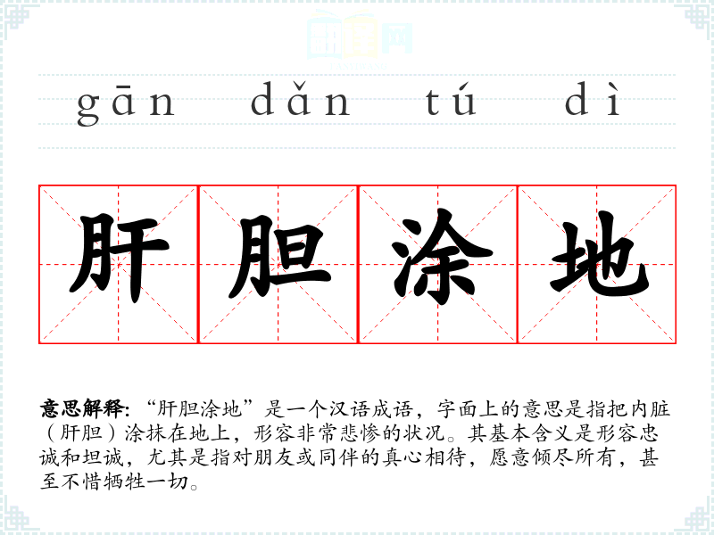 “肝胆涂地”是一个汉语成语,字面上的意思是指把内脏(肝胆)涂抹在地上,形容非常悲惨的状况。其基本含义是形容忠诚和坦诚,尤其是指对朋友或同伴的真心相待,愿意倾尽所有,甚至不惜牺牲一切。