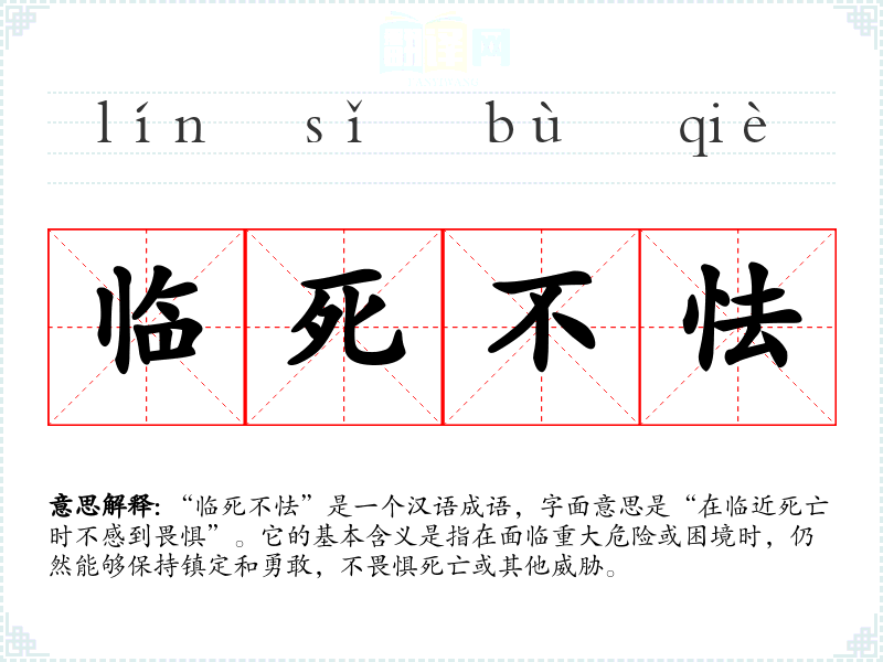 “临死不怯”是一个汉语成语,字面意思是“在临近死亡时不感到畏惧”。它的基本含义是指在面临重大危险或困境时,仍然能够保持镇定和勇敢,不畏惧死亡或其他威胁。