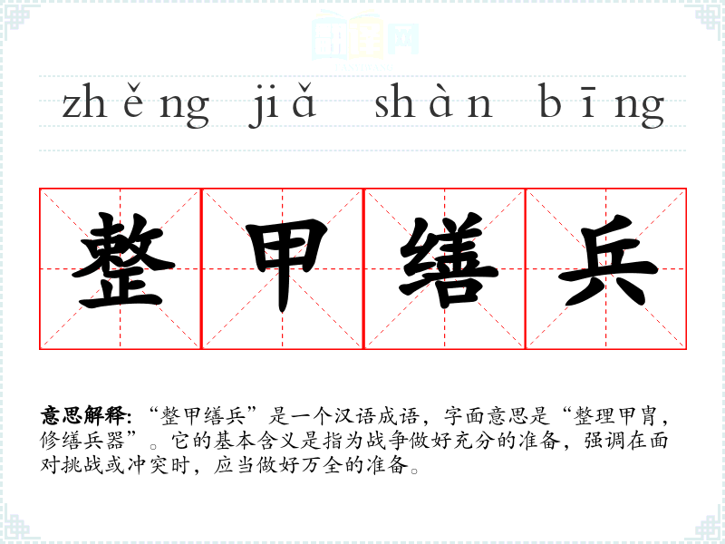 “整甲缮兵”是一个汉语成语,字面意思是“整理甲胄,修缮兵器”。它的基本含义是指为战争做好充分的准备,强调在面对挑战或冲突时,应当做好万全的准备。