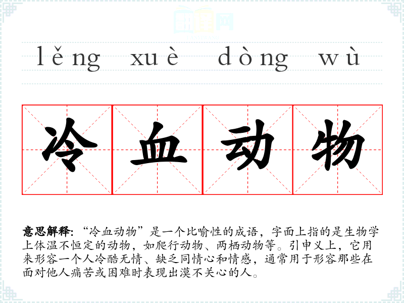 “冷血动物”一词的起源与生物学有关,最早用于描述生物分类学中的一种动物特征。在汉语中,成语的使用逐渐扩展,尤其在文学作品和社会评论中,成为形容人性冷漠的常用词汇。虽然没有特定的文献出处,但它的使用可以追溯到现代社会对情感冷漠的讨论。