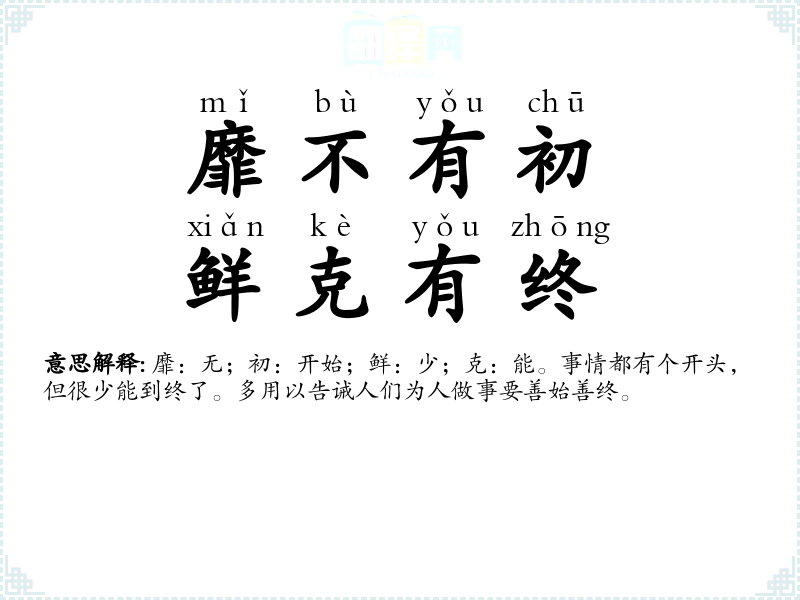 靡:无;初:开始;鲜:少;克:能。事情都有个开头,但很少能到终了。多用以告诫人们为人做事要善始善终。 |