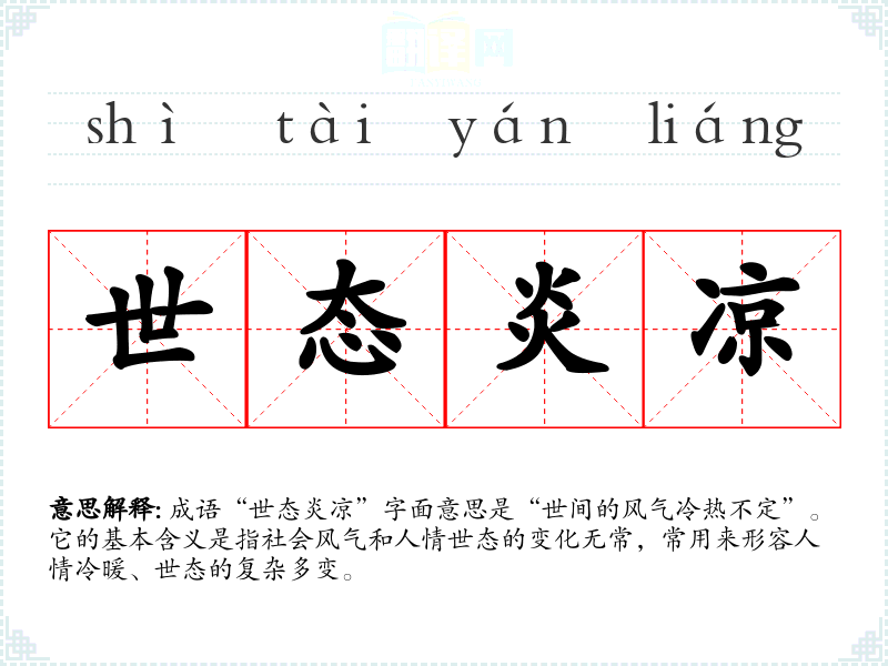 成语“世态炎凉”字面意思是“世间的风气冷热不定”。它的基本含义是指社会风气和人情世态的变化无常,常用来形容人情冷暖、世态的复杂多变。