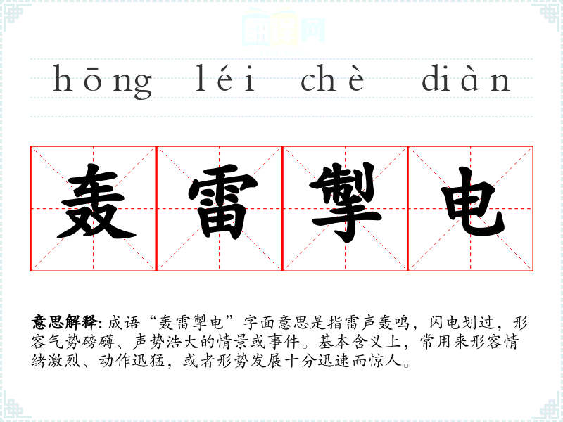 成语“轰雷掣电”字面意思是指雷声轰鸣,闪电划过,形容气势磅礴、声势浩大的情景或**。基本含义上,常用来形容情绪激烈、动作迅猛,或者形势发展十分迅速而惊人。