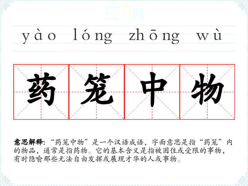 “药笼中物”是一个汉语成语,字面意思是指“药笼”内的物品,通常是指药物。它的基本含义是指被困住或受限的事物,有时隐喻那些无法自由发挥或展现才华的人或事物。