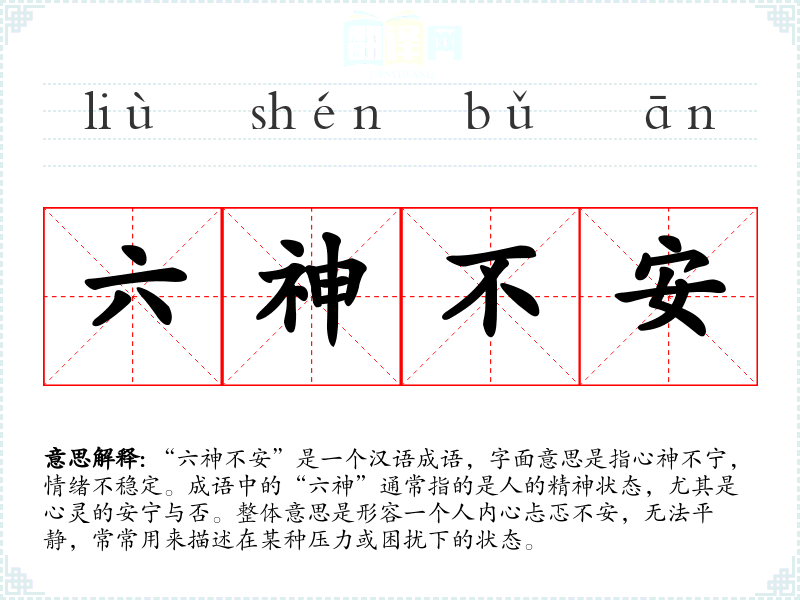 “六神不安”是一个汉语成语,字面意思是指心神不宁,情绪不稳定。成语中的“六神”通常指的是人的精神状态,尤其是心灵的安宁与否。整体意思是形容一个人内心忐忑不安,无法平静,常常用来描述在某种压力或困扰下的状态。