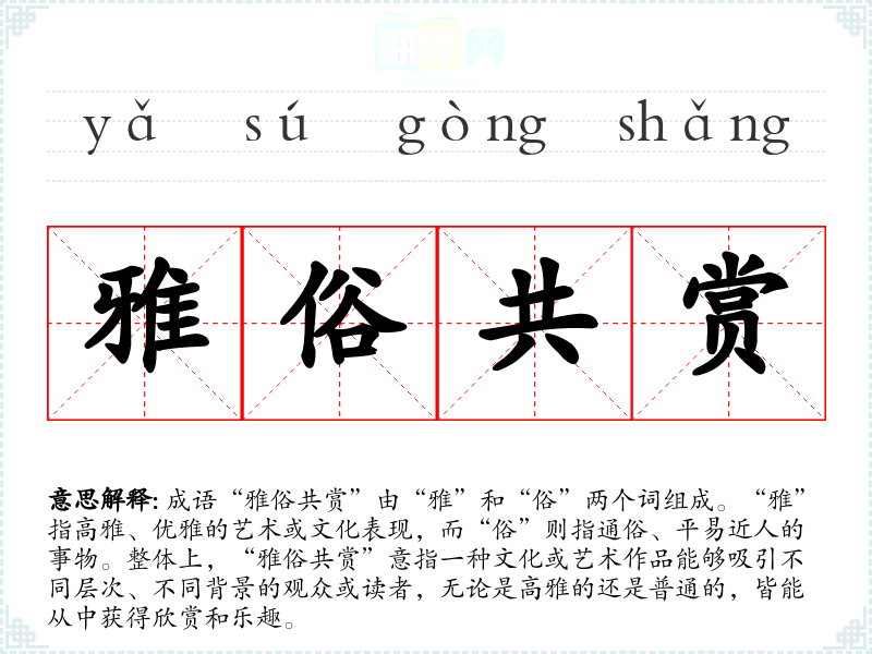 | 雅俗共赏 | 形容某些文艺作品既优美,又通俗,各种文化程度的人都能够欣赏。 |